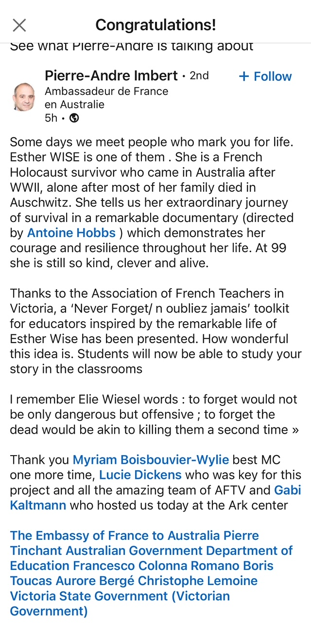 The kit pédagogique was officially launched at the ARK Centre in Hawthorn East, on Wednesday 29 February. The launch was attended by the French Ambassador to Australia, Pierre-André Imbert and Honorary Consul of France, Myriam Boisbouvier-Wylie.