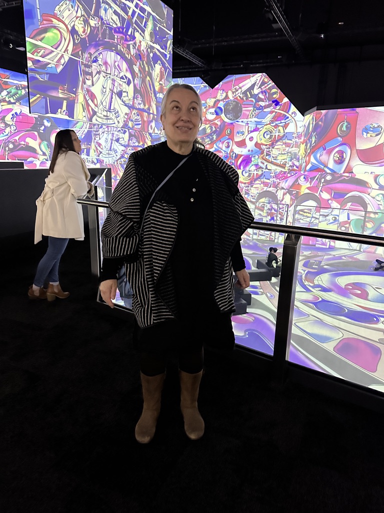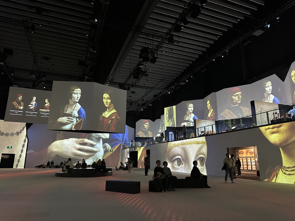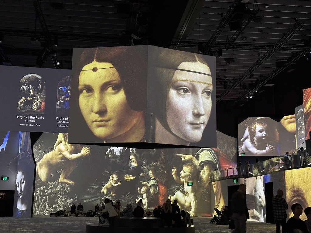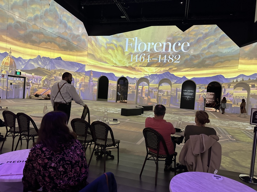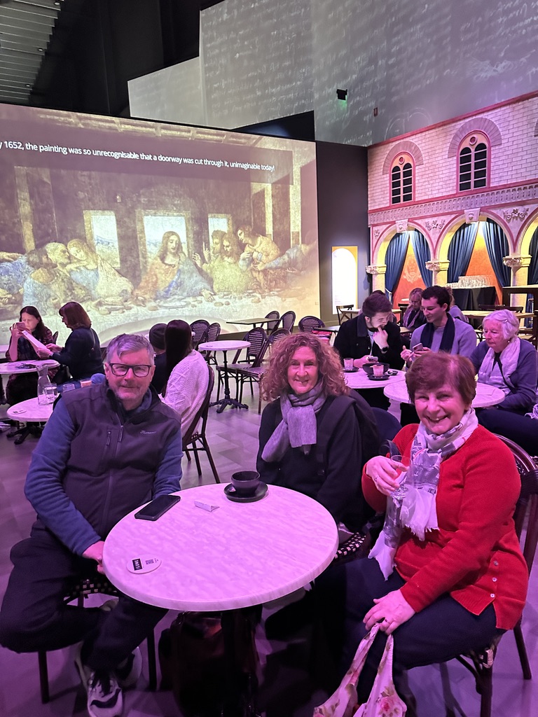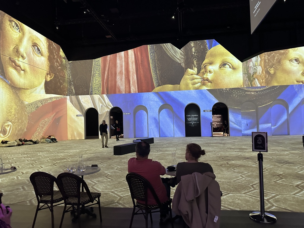 Via the wall projections we entered the narrative of Leonardo's life beginning in his birthplace, Vinci, and ending in Amboise, France, where he spent the last 20 years of his life, selling his masterpiece, the Mona Lisa (La Joconde), to his friend François 1; as well we visited Italian cities where he worked- Florence, Venice, Milan and saw his developing talent as an artist. This was followed by examples of works by other significant Italian artists who succeeded Leonardo such as Michelangelo, Titian, Botticelli, Raphael, Caravaggio, Giotto…plus an analysis of Leonardo's restored The Last Supper.