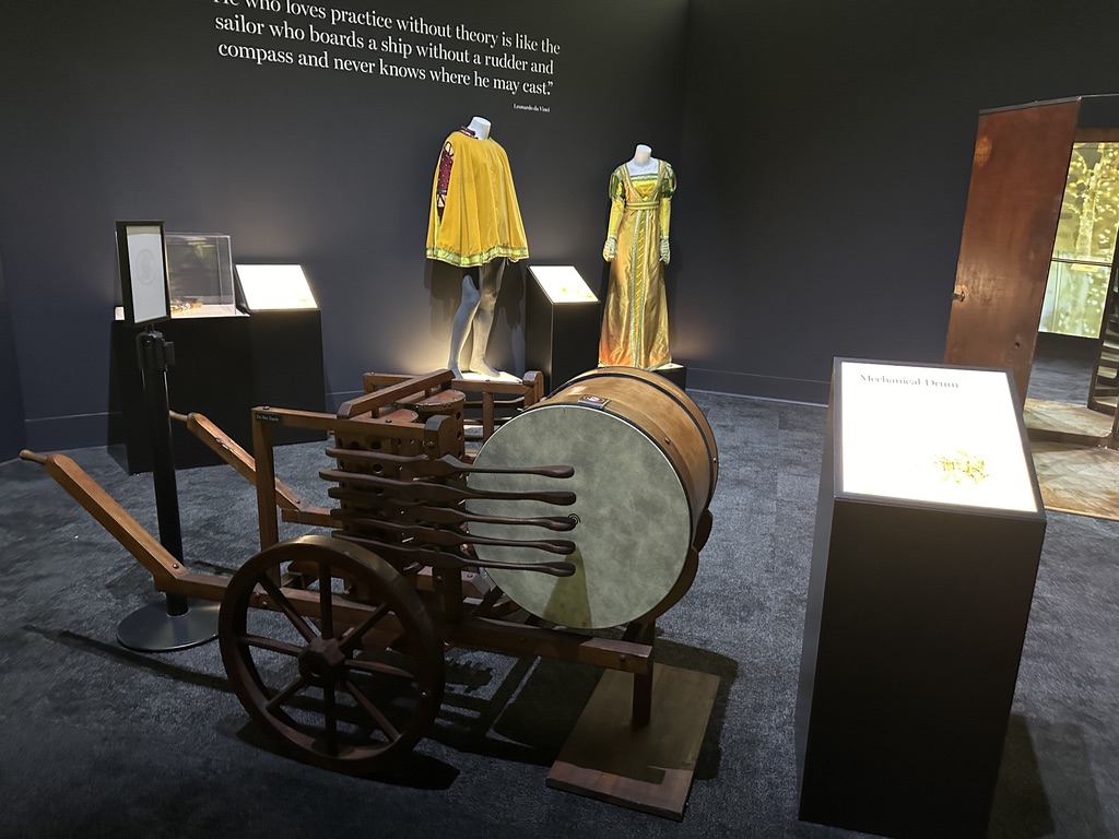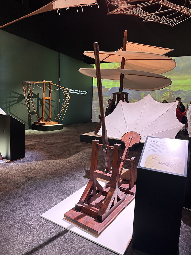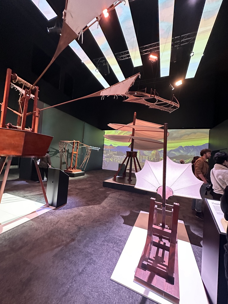 As an artist, inventor, scientist, philosopher, musician, costume designer his insatiable curiosity spanning anatomy, engineering, flying machines, hydraulic systems, architecture, engineering ,flight and war machinery can be seen both in the upstairs gallery (where we are able to try out some of the inventions ) and in some rare original pages from his Codex Atlanticus notebooks.