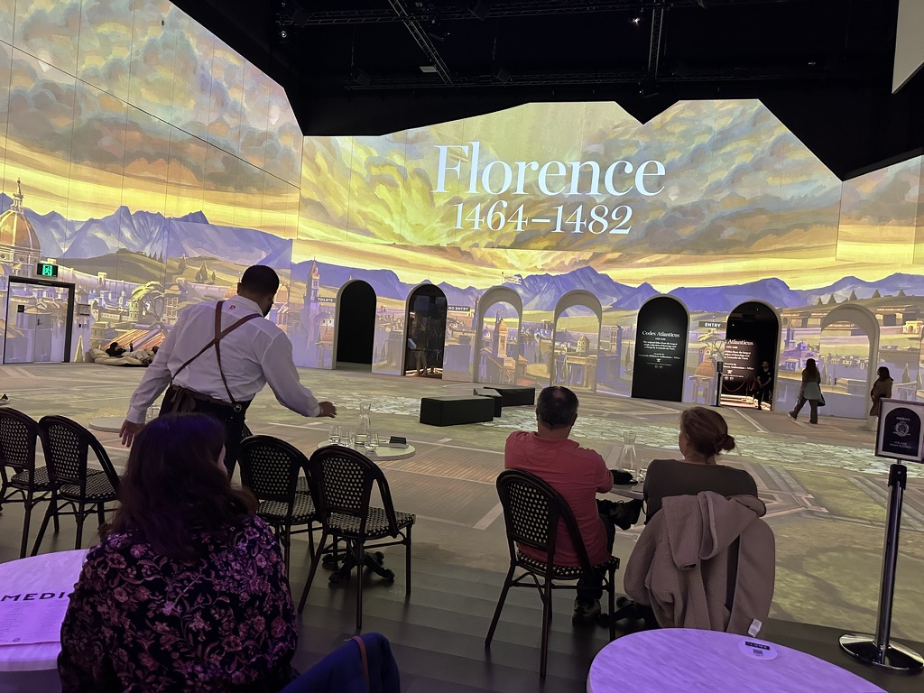 At the Lume on Sunday 4 August I opted to thrust myself into the immersive world of a 3D virtual simulation transported me into the heart of Florence. As the simulation began, I found myself soaring above the terracotta rooftops, the vibrant cityscape unfolding beneath me. My journey starts over the iconic Duomo di Firenze, its magnificent dome, a beacon of Renaissance architecture. I glide past the Campanile di Giotto, the bell tower standing tall and majestic. The Arno River glistens below, its gentle curves guiding me towards the historic Ponte Vecchio, this medieval stone bridge is a wonderful sight.