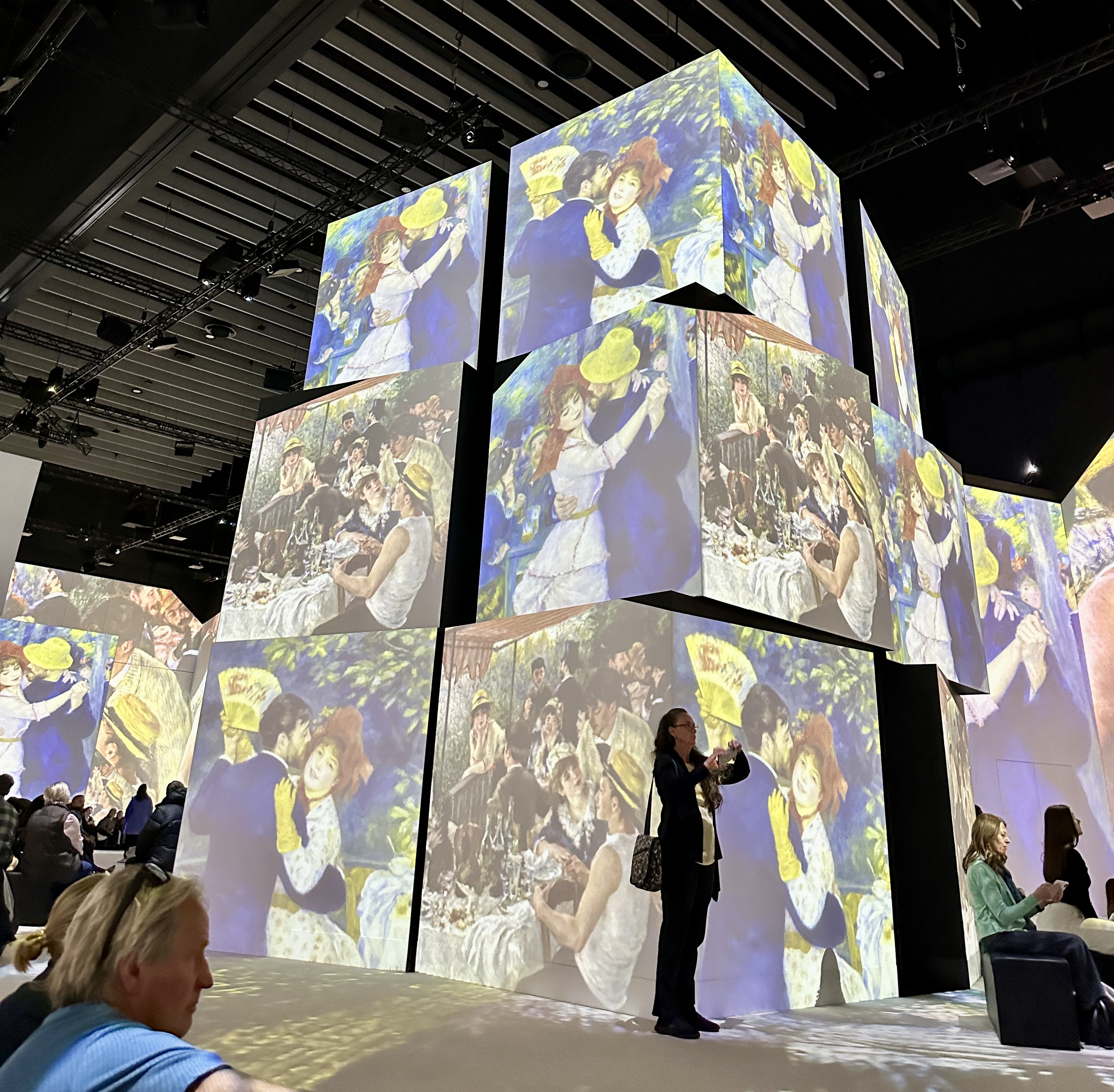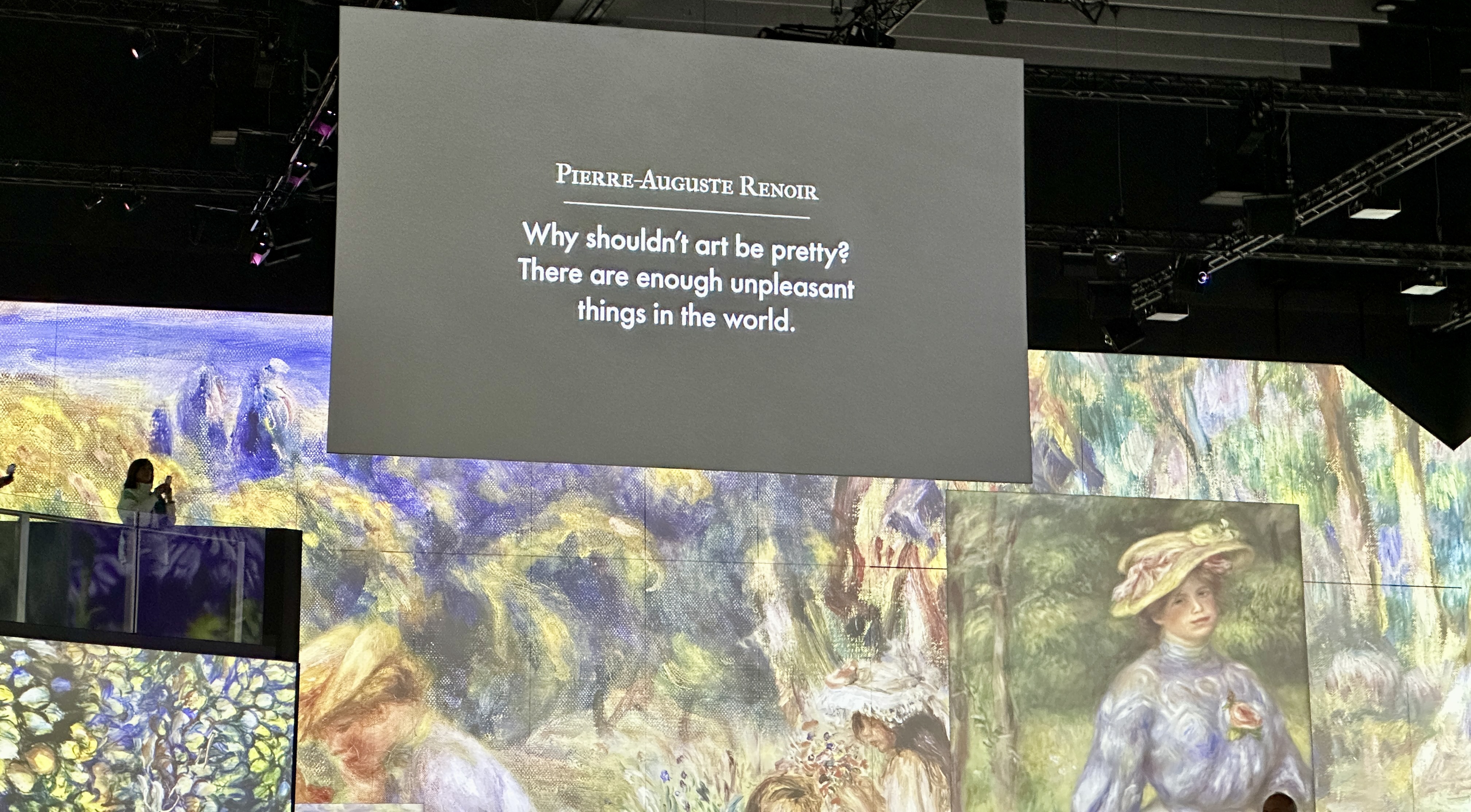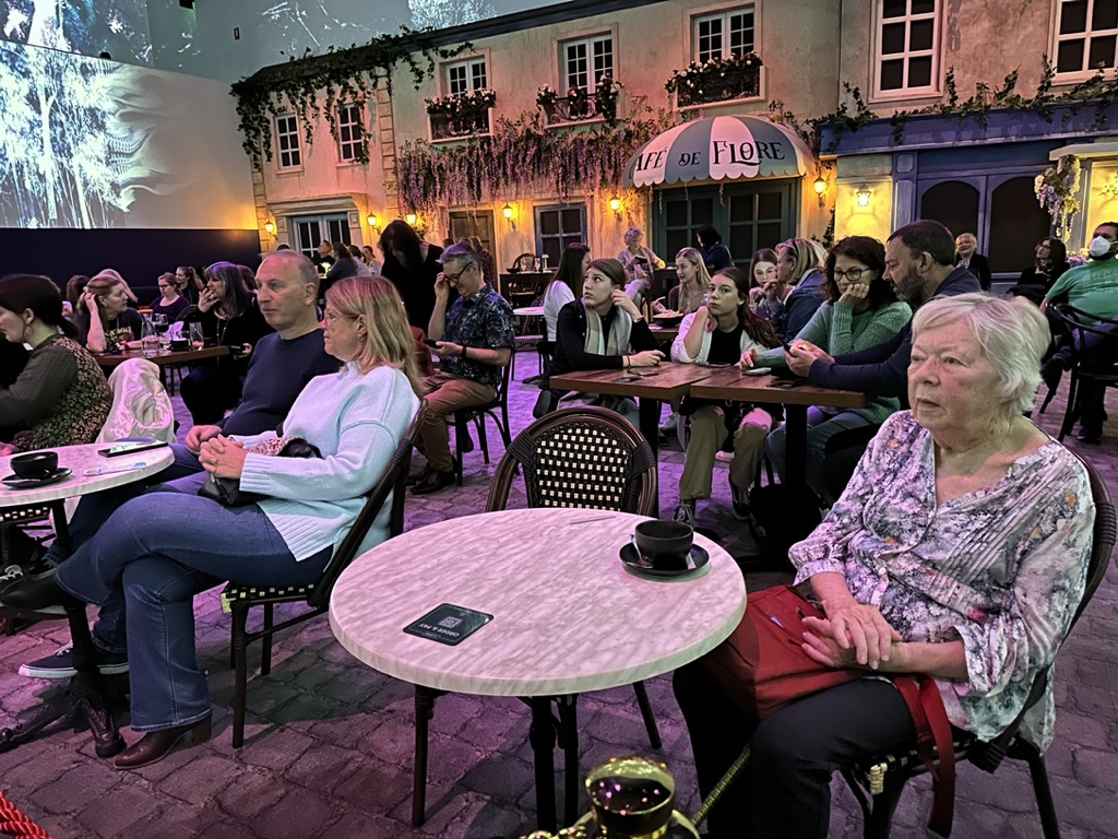 We entered crossing the bridge to admire the waterlilies at Giverny and then to the main space to see the walls come alive with projections of both old friends and some less familiar works. Many came as a prelude to organizing an excursion for their students* and others came to simply immerse themselves in this unique sensory experience- enjoy the art works, the musical accompaniments, to absorb the artists’ attitudes and beliefs and perhaps also to enjoy the French flavours on offer at the Café de Flore.