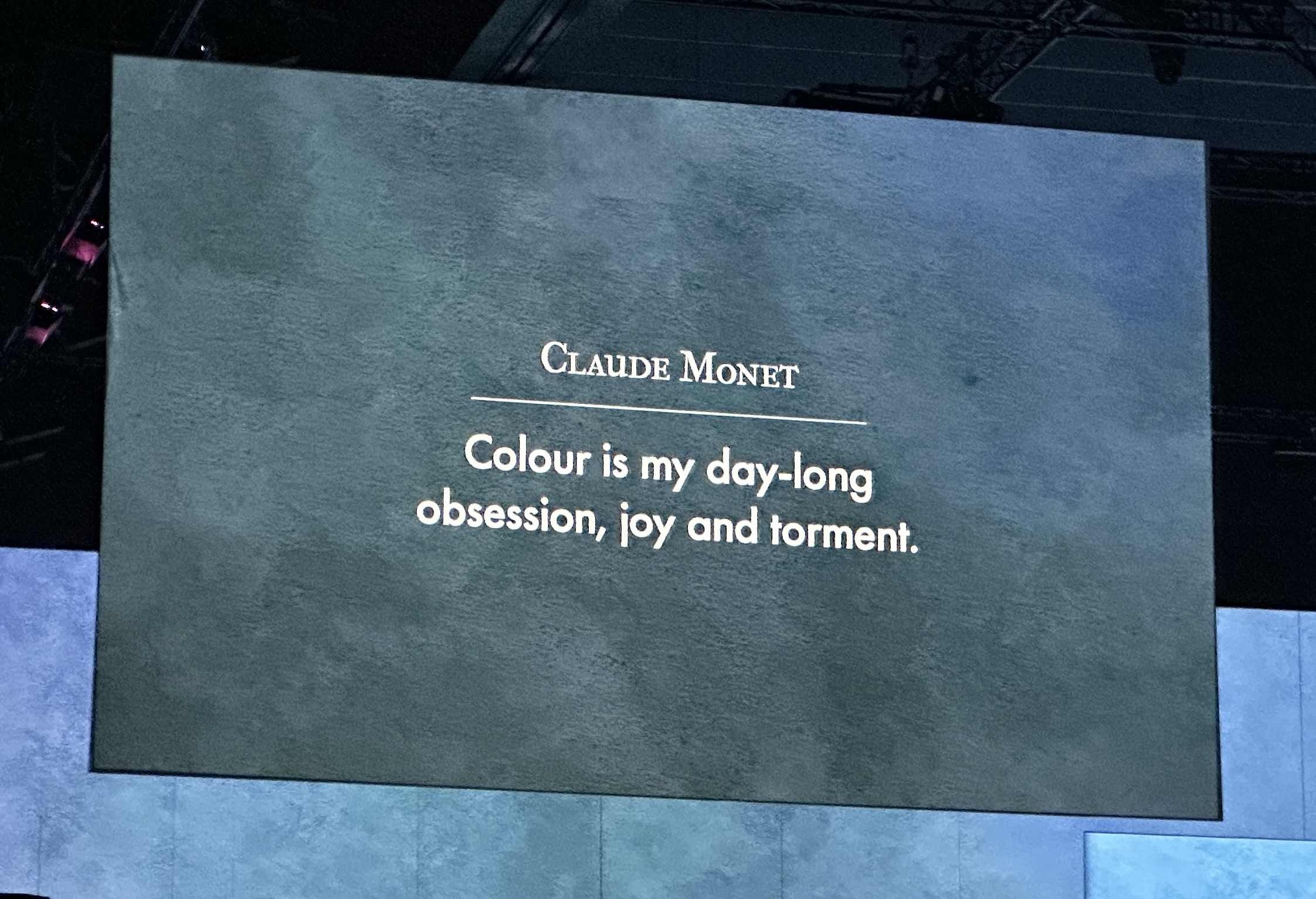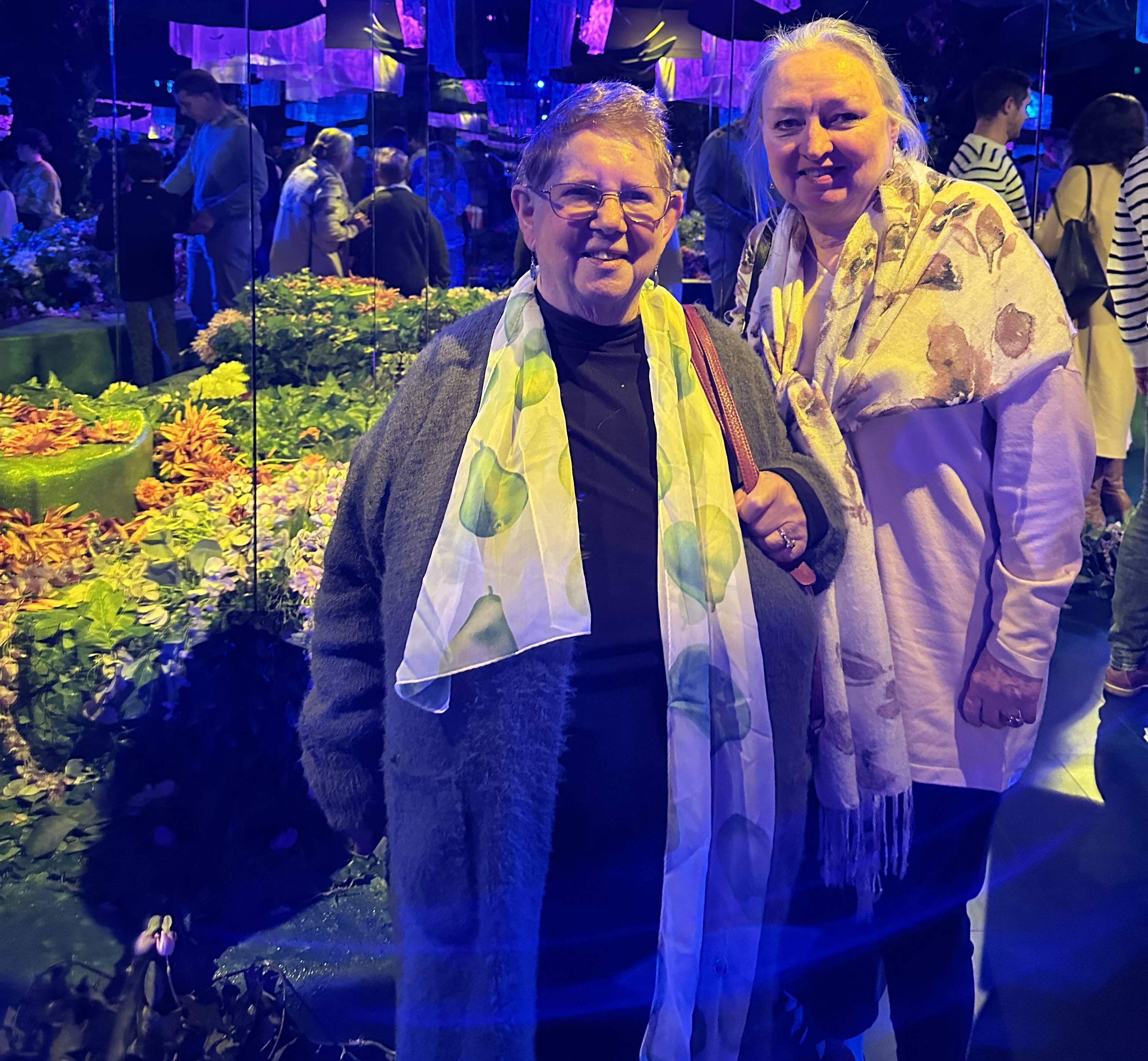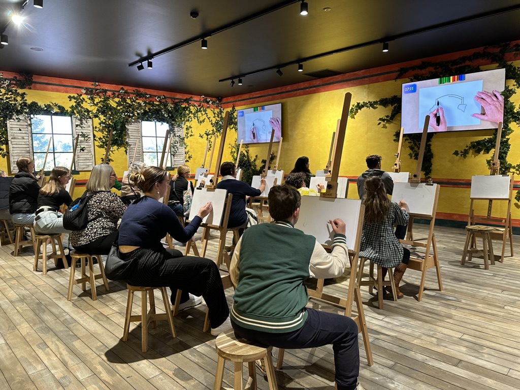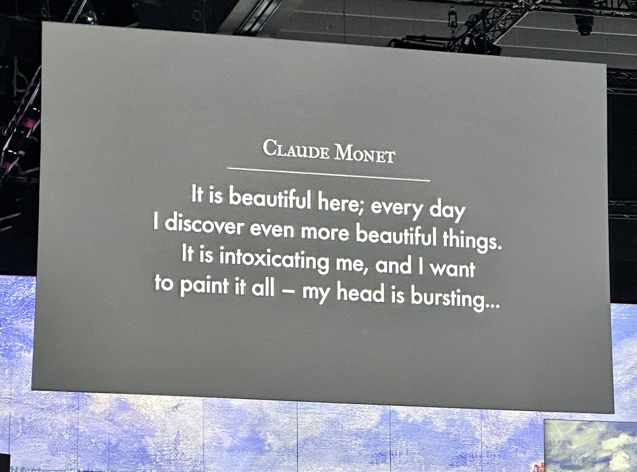 We entered crossing the bridge to admire the waterlilies at Giverny and then to the main space to see the walls come alive with projections of both old friends and some less familiar works. Many came as a prelude to organizing an excursion for their students* and others came to simply immerse themselves in this unique sensory experience- enjoy the art works, the musical accompaniments, to absorb the artists’ attitudes and beliefs and perhaps also to enjoy the French flavours on offer at the Café de Flore.