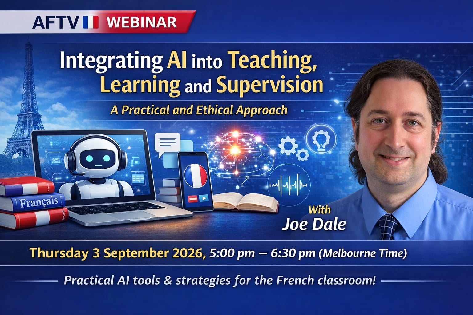This practical 90-minute webinar to be presented by Joe Dale, explores how artificial intelligence can support the teaching of French through effective and classroom-ready workflows. Grounded in a Human-in-the-Loop approach, the session shows how teachers can use AI as a creative partner to generate lesson plans, culturally relevant stories, listening dialogues and pronunciation models while maintaining professional judgement and protecting student data.