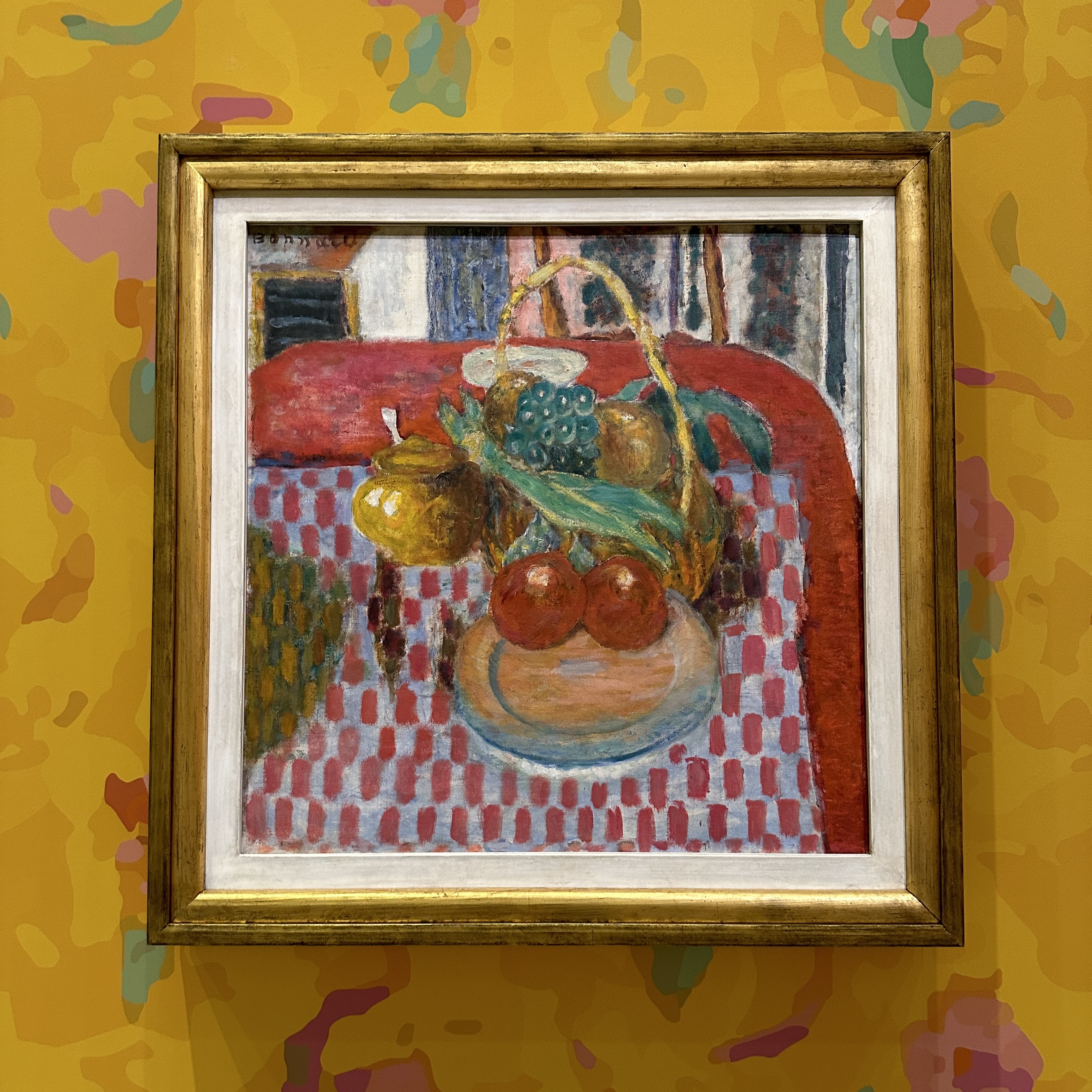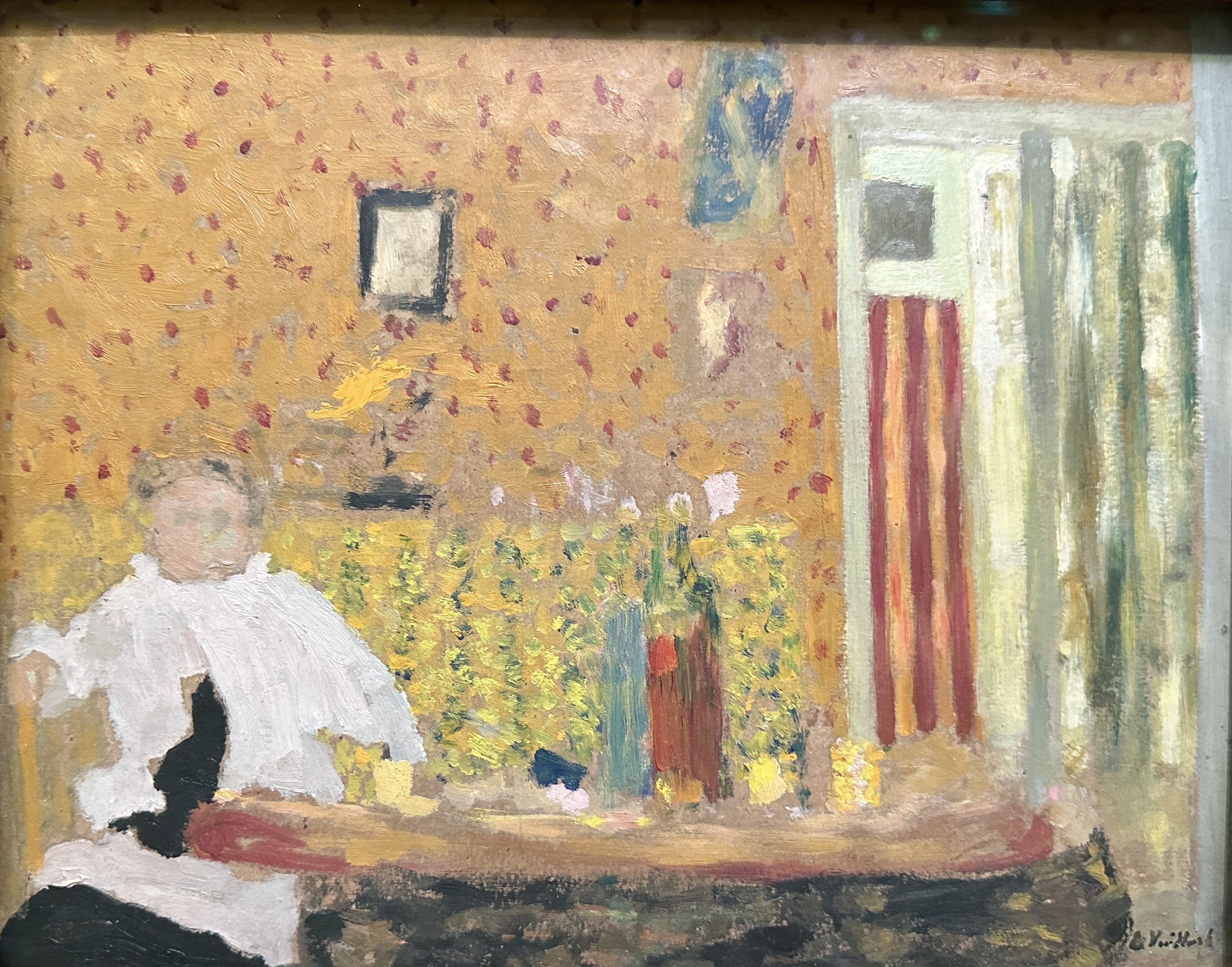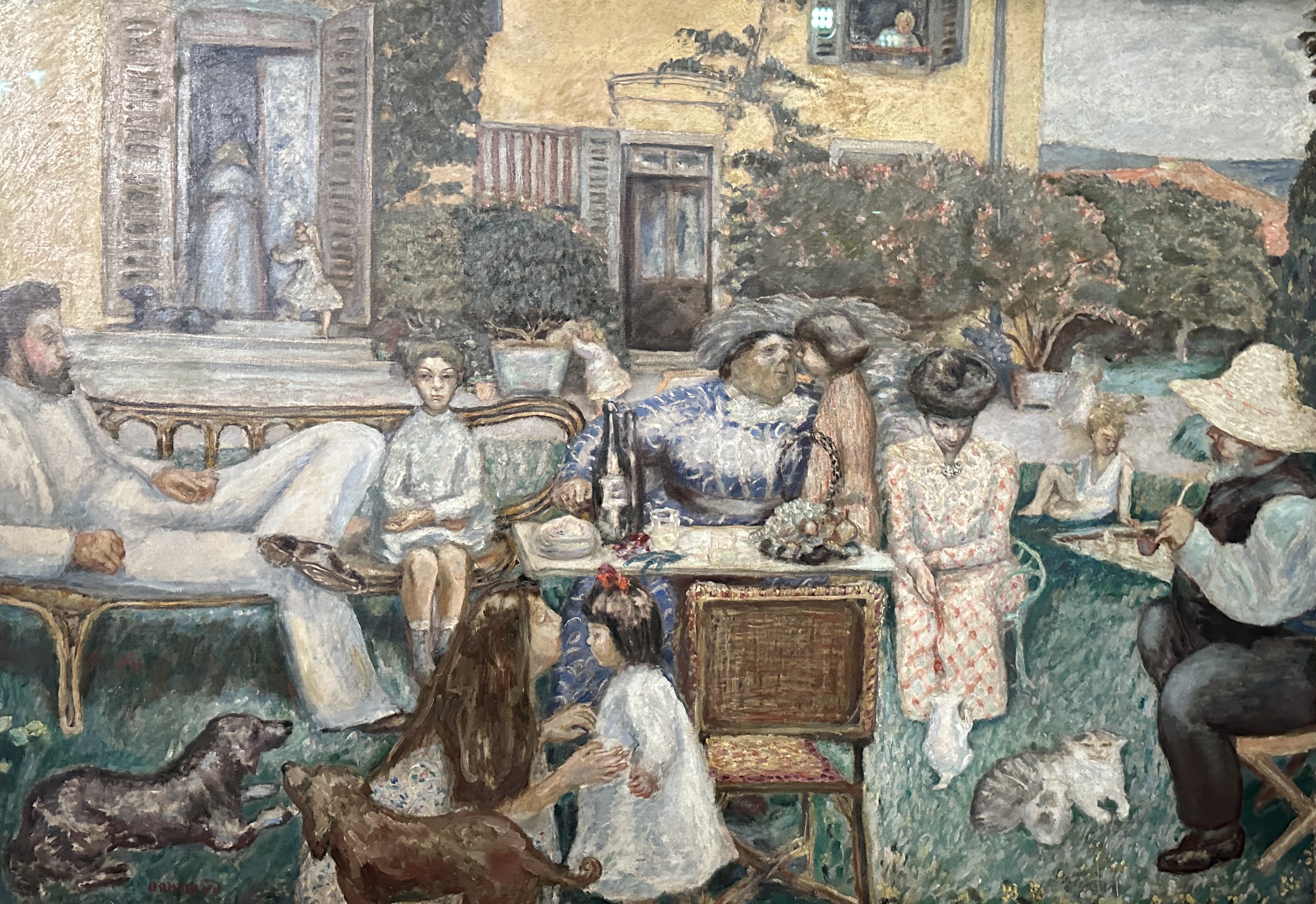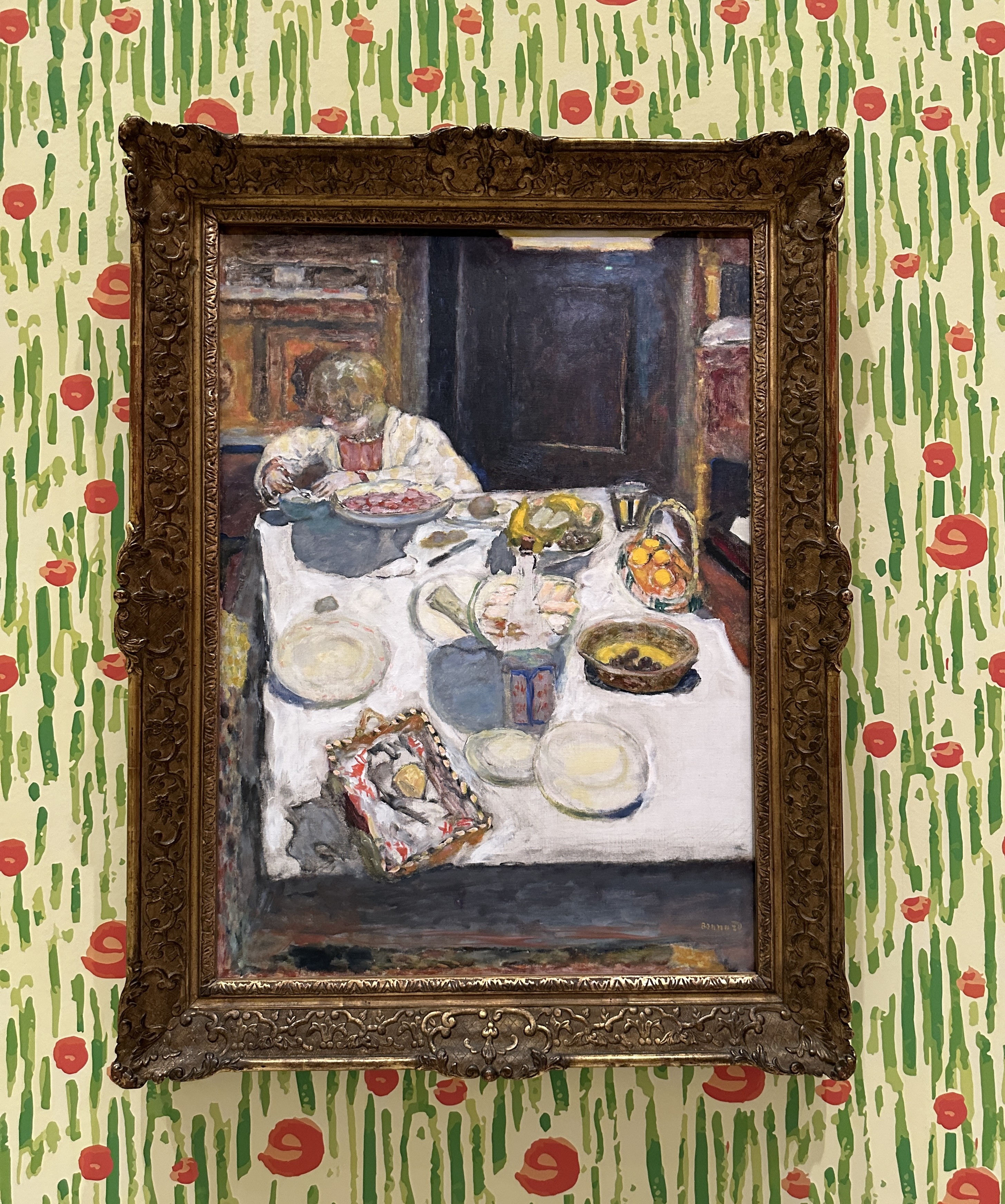 Paris-based architect and designer India Mahdavi, a ‘virtuoso of colour’ and winner of Designer of the Year at the 2023 Wallpaper Design Awards, showcases Pierre Bonnard’s works in an innovative environment that complements his use of colour and texture to create a feeling of domesticity. Eventually reaching Le Cannet we entered Bonnard’s private life and landscapes in the bright colours reflected in the wallpapers reproduced by Mahdavi. Amongst our group there were mixed reactions to India’s scenography- some found it a bit overwhelming, whereas others loved the wallpapers, checking the paintings to find some of the reproductions as well as the touches of daily life with many pets, table settings, with apt furniture and carpets to reinforce this domestic atmosphere.