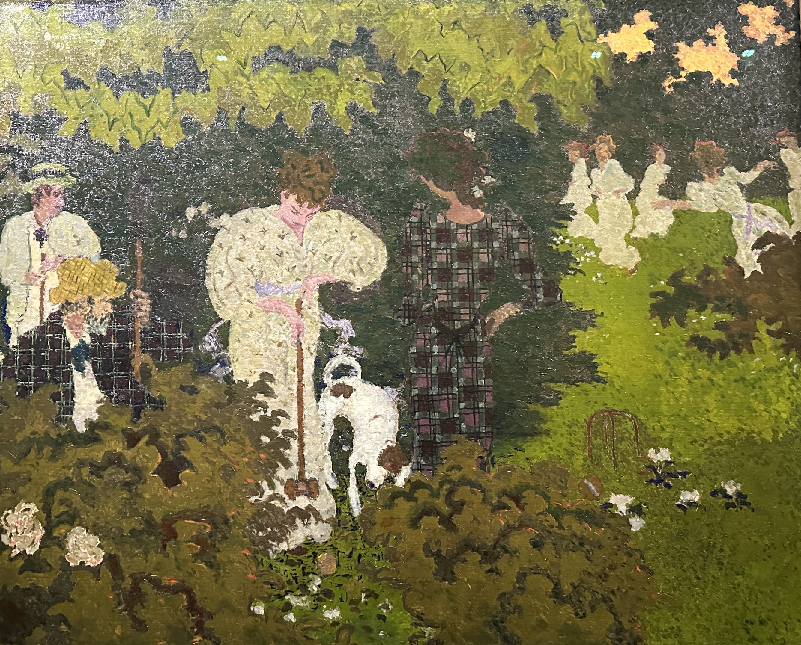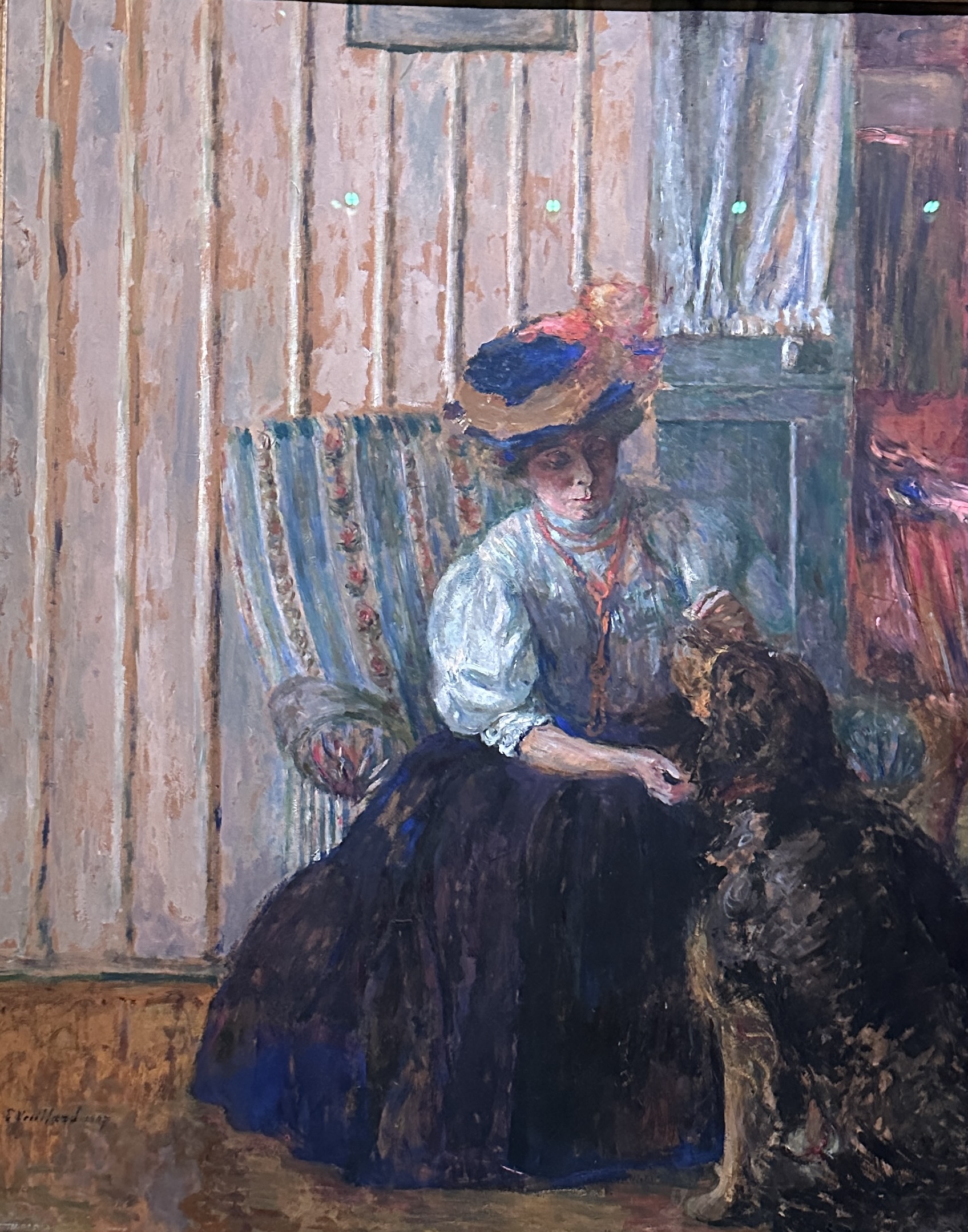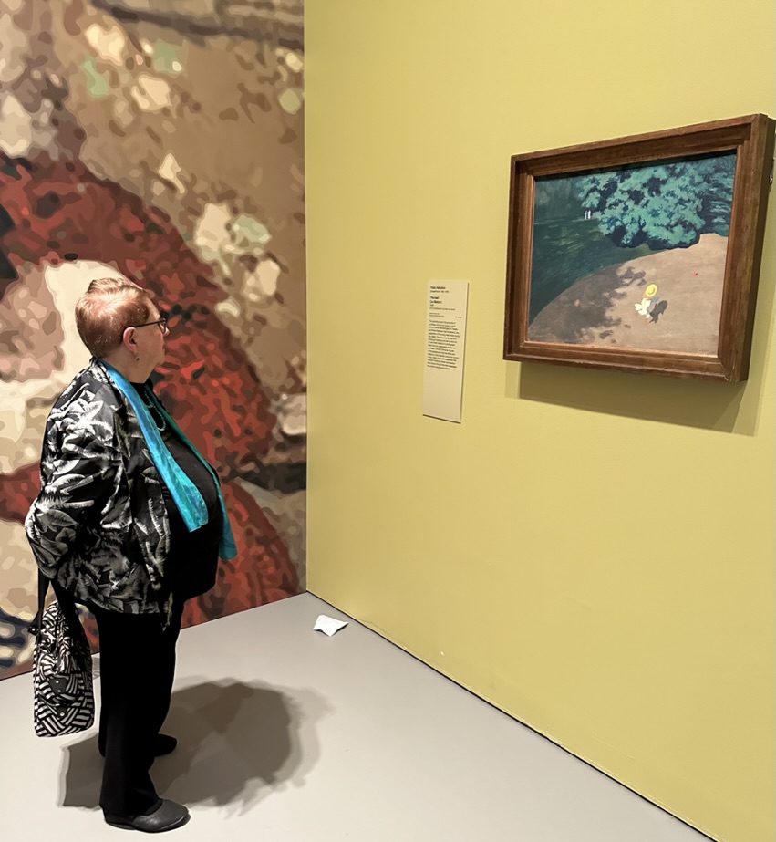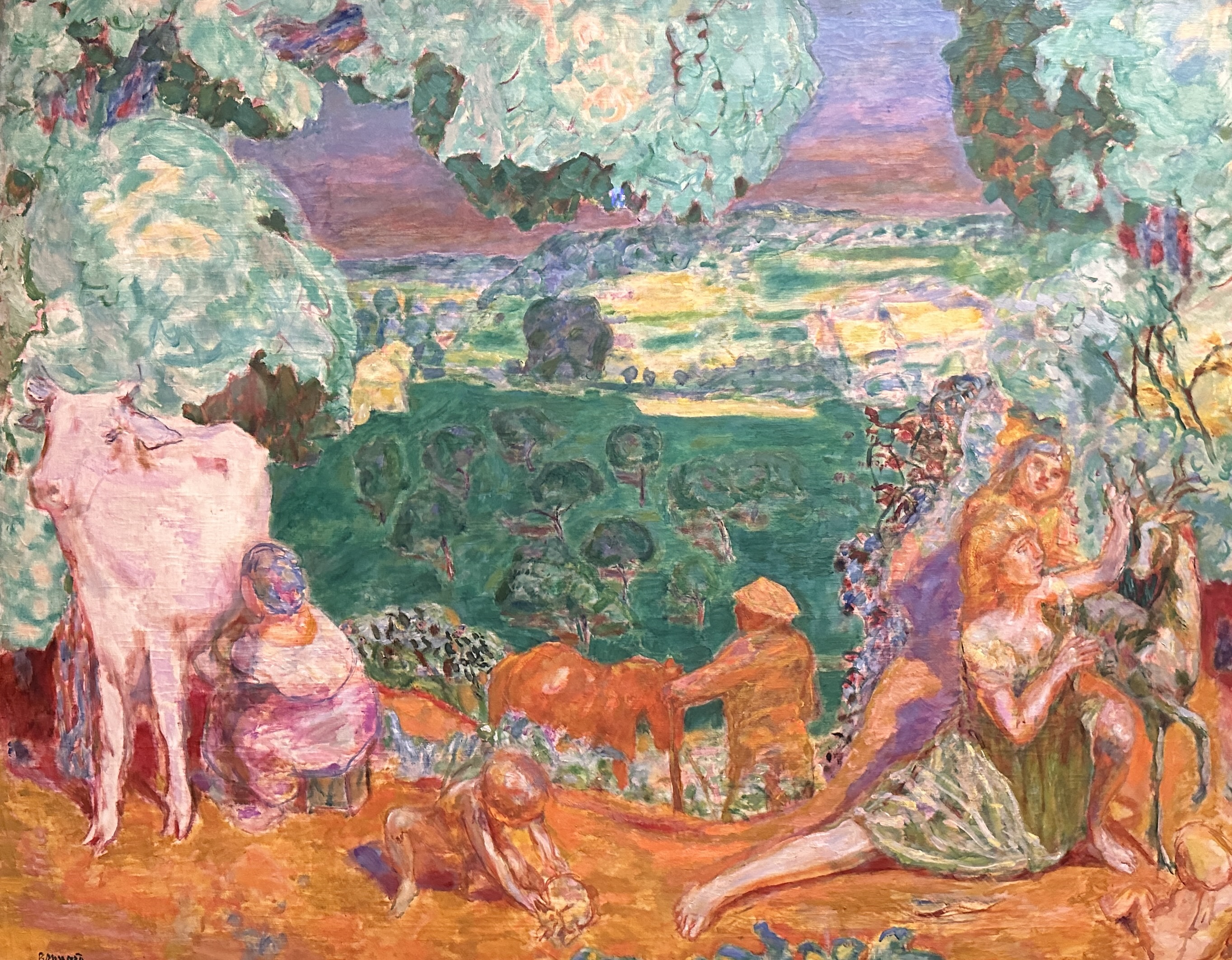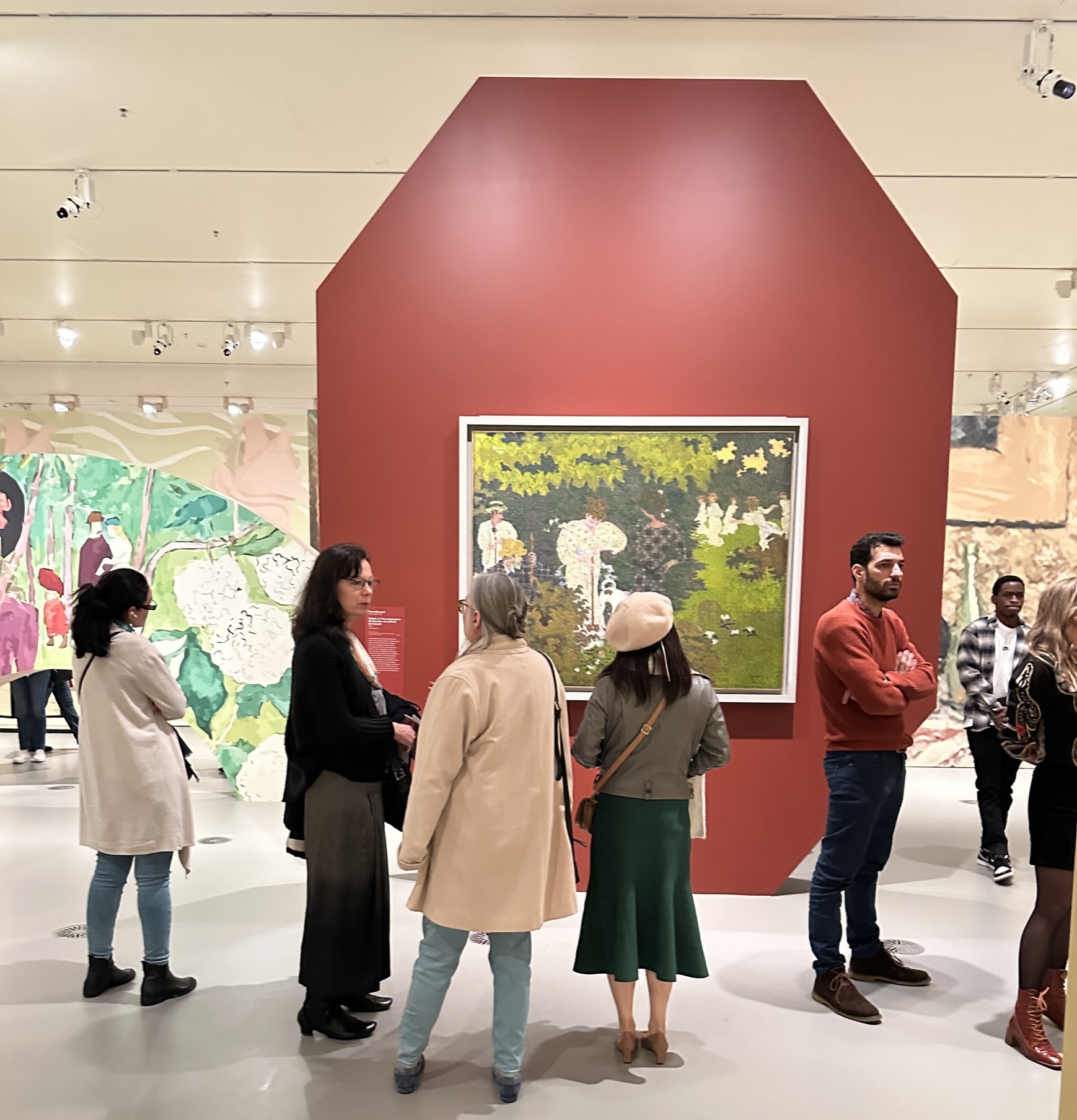 Paris-based architect and designer India Mahdavi, a ‘virtuoso of colour’ and winner of Designer of the Year at the 2023 Wallpaper Design Awards, showcases Pierre Bonnard’s works in an innovative environment that complements his use of colour and texture to create a feeling of domesticity. Eventually reaching Le Cannet we entered Bonnard’s private life and landscapes in the bright colours reflected in the wallpapers reproduced by Mahdavi. Amongst our group there were mixed reactions to India’s scenography- some found it a bit overwhelming, whereas others loved the wallpapers, checking the paintings to find some of the reproductions as well as the touches of daily life with many pets, table settings, with apt furniture and carpets to reinforce this domestic atmosphere.